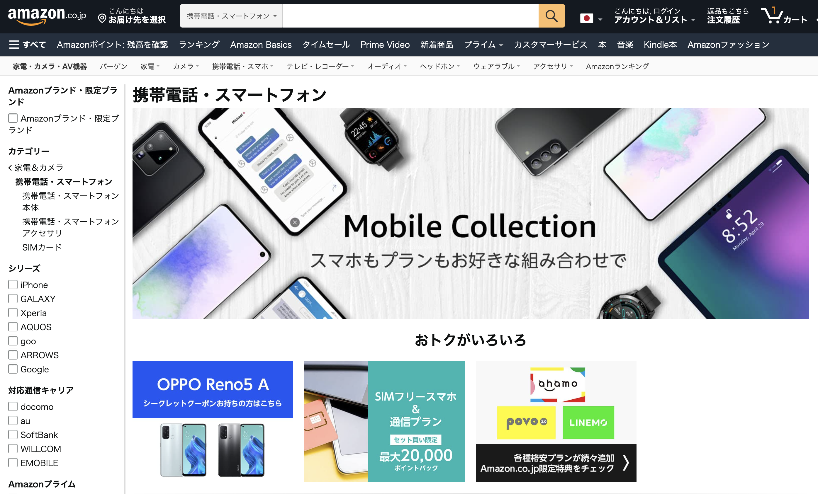 そして、Amazonの「モバイルコレクション」のページには「おトクがいろいろ」でAmazon限定の特典クーポンやキャンペーンなどがまとめられているところも特徴。