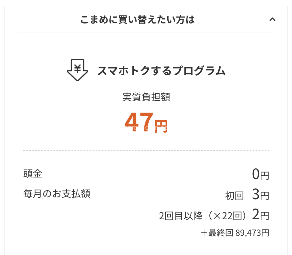 この「実質47円」という金額は、割引施策と「スマホトクするプログラム」を組み合わせた場合に、最終回(24回目)の支払いが免除された結果として、23回分までの支払い総額を示しています。