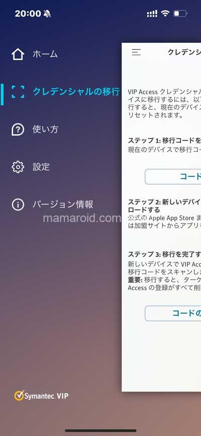 - 旧スマートフォンの「VIP Access」アプリを開き、左上のメニューから「クレデンシャルの移行」を選択します。ここで移行コードを表示。