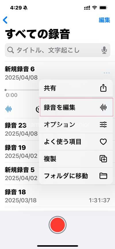 - 表示されたメニューの中から「録音を編集」をタップ。