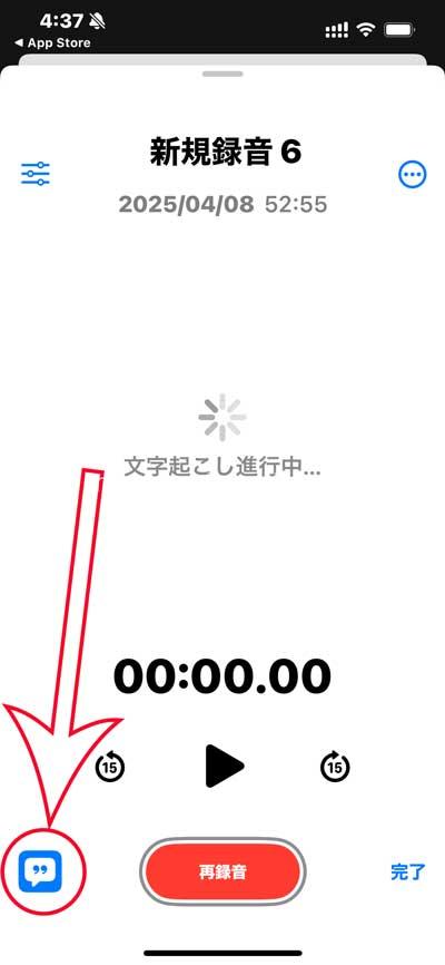 - 編集画面の左下にある吹き出しのようなマークをタップすると、自動で文字起こしがスタートします。