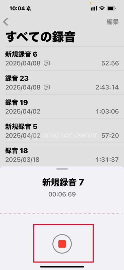 録音を終えたいときは、同じ場所に表示される四角い停止ボタンをタップします。