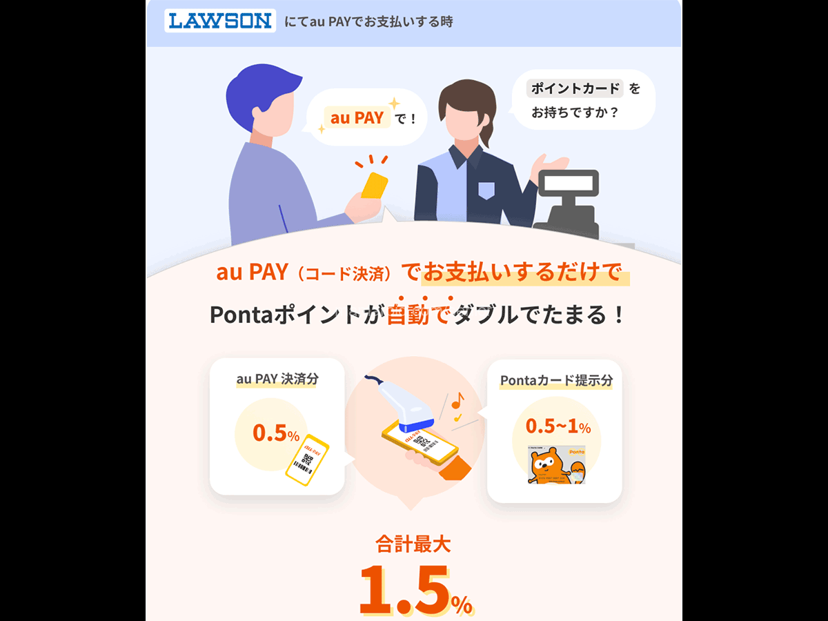 2022年11月22日から、ローソン店舗 (ローソン、ローソンストア100、ナチュラルローソン) でのau PAY決済時に、Pontaカードを提示せずともPontaポイントが自動にダブルでたまるようになりました。