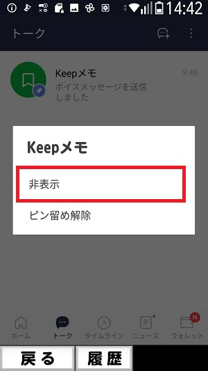 非表示の方法は「Keepメモ」欄を2秒以上長押しすると表示されるポップアップの「非表示」を押せばOK。