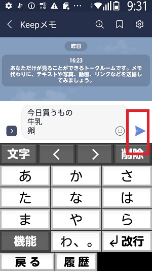2、メモしたいことを、通常の友だちとのトークと同じ要領で送信します。