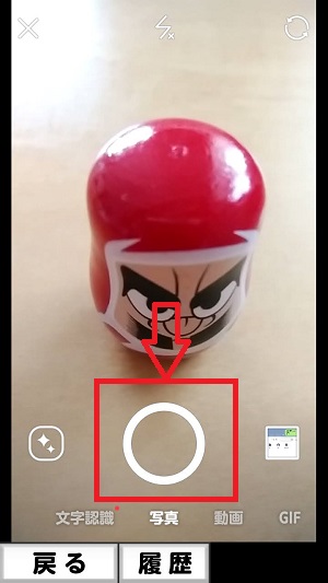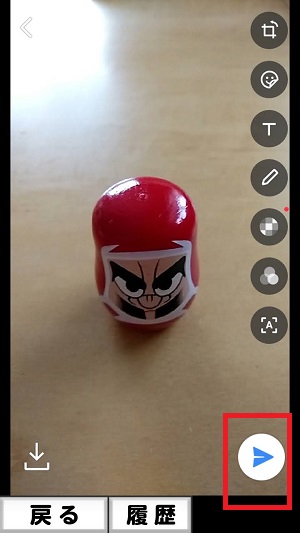 カメラマークを押す>下部中央のシャッター(白丸)を押す>右下の飛行機マークを押す