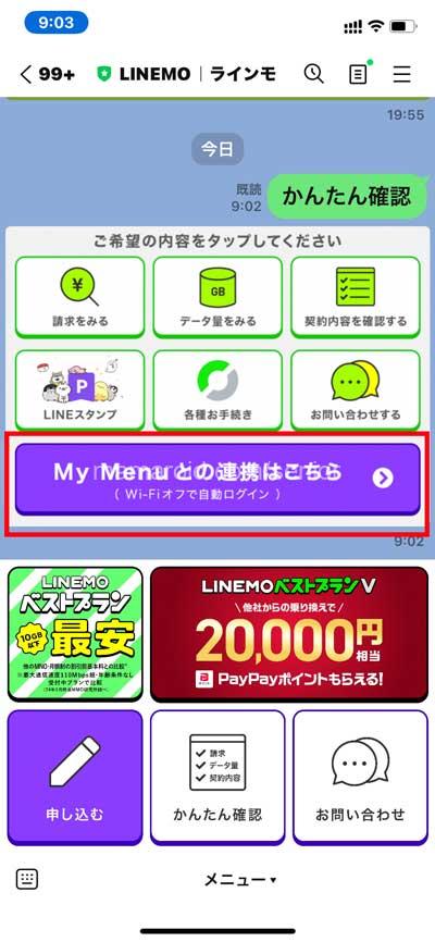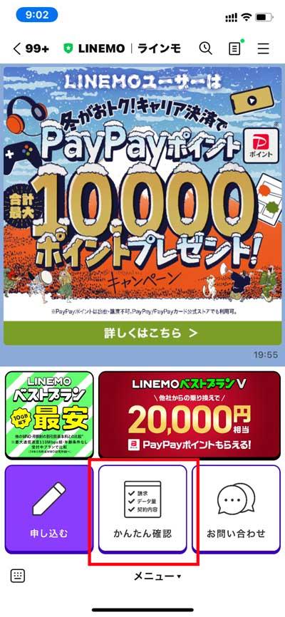 LINEMOの公式アカウントのトーク画面を開き、メニュー内にある「かんたん確認」をタップ