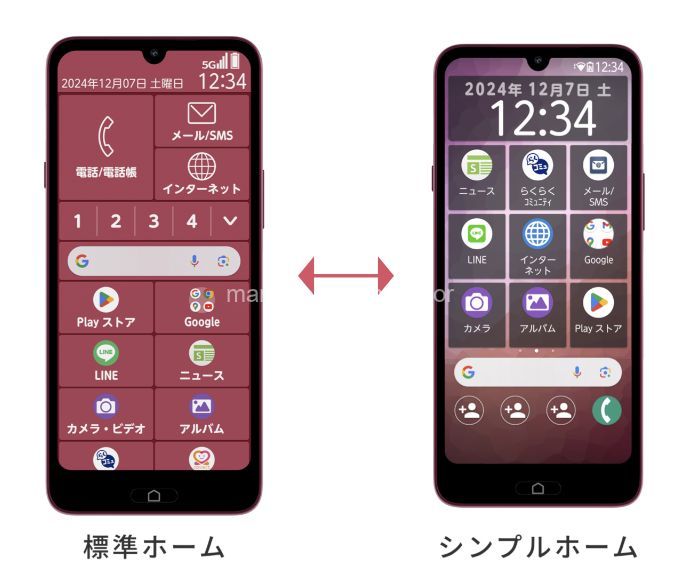 画面が約6.1インチの大きめサイズで、文字やアイコンが見やすく操作も直感的です。シニア向けの「標準ホーム」画面に切り替えれば、迷わず使えるレイアウトになります。