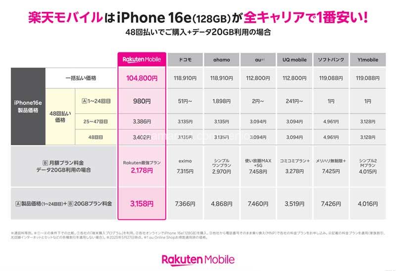 2025年6月3日から、楽天モバイルが始めた新キャンペーンでは、iPhone16e(128GB)を月々980円で購入可能。料金プラン「Rakuten最強プラン」に加入することで、この価格で購入できます。