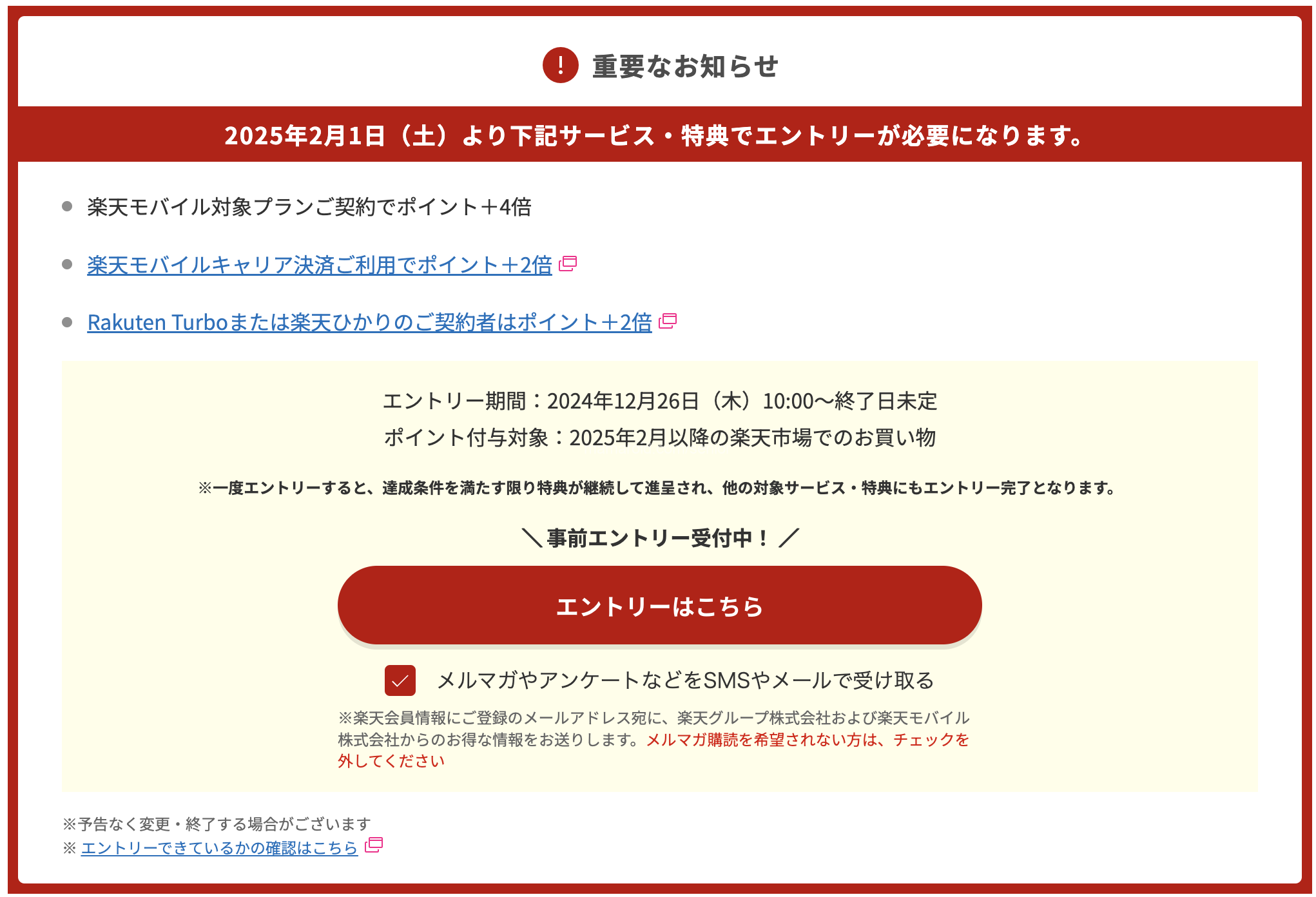 2025年2月から新たに「エントリー制」が導入されることで、楽天ポイントの優遇を受けるにはエントリーが必須となりました。