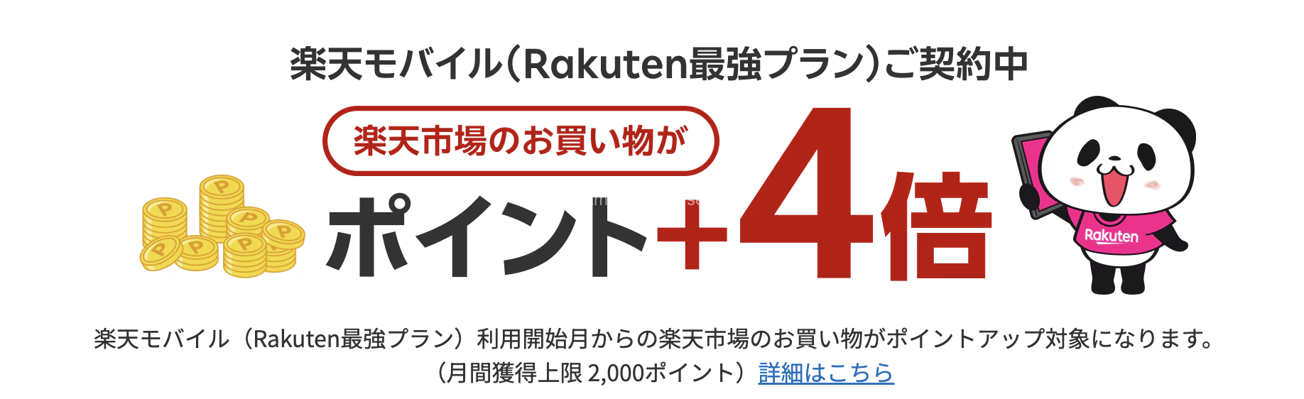 - 楽天モバイル最強プラン契約:楽天市場でのお買い物ポイント+4倍。