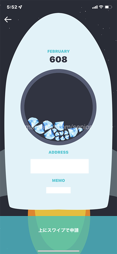その受け取るための口座のアドレス(とメモ)を入力して、溜まったジェムを仮想通貨として受け取るための申請をします。