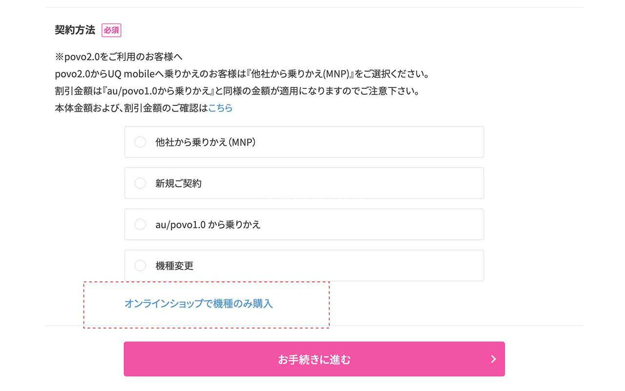 UQモバイルのオンラインショップにアクセスして、欲しい機種のページへいき、契約方法の下部にある「オンラインショップで機種のみ購入」と書かれた箇所をタップすればOK。