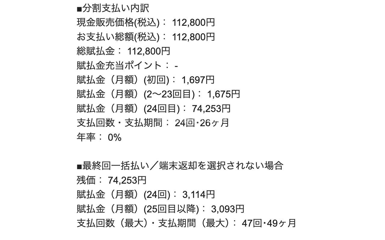 契約が完了すると支払いに関するメールが届き、そちらでも確認できますが、24回目の端末を返却すれば支払いが免除される金額が74,253円となっています。