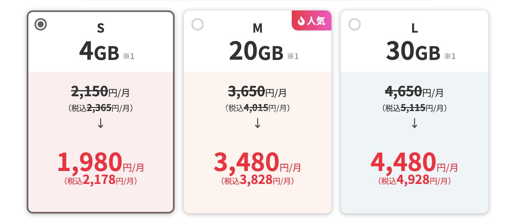 シンプル2 S | 2,365円 | 4GB | 1,078円(家族割+PayPayカード割適用時) | ・だれとでも定額:880円/月 ・スーパーだれとでも定額:1,980円/月 | 最大300kbps |